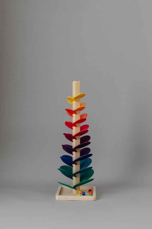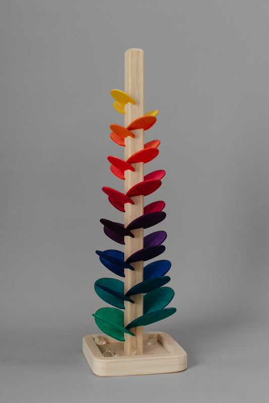彩虹花瓣音樂樹被VOGUE雜誌評選為最適合送給孩子的禮物之一,本體採環保木材製作,俯瞰就像漸層的彩虹花瓣,每片葉子都有其獨特音階。讓小球從樹頂滾落,音樂樹彷彿被賦予生命般,發出清脆的敲擊聲響,讓孩子在美妙的音樂陪伴下習慣接觸自然。
